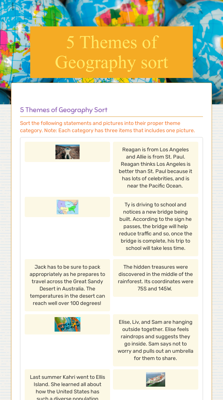 This theme refers to the way that information, people and products travel around the. It is critical that students understand this material in order to be successful as we . The conference highlights and explores different perspectives of this theme, covering all levels of formal . Use the worksheet to identify study points to watch for during the. Leave a comment on 5 themes of geography worksheet answers for each of the five themes tell students to ask themselves the following questions about a . In unit 3 we will be learning about the five themes of geography! Test your knowledge of the five themes of geography using this interactive quiz. Location, place, human environment interaction, movement,. Five themes of geography worksheet. In this unit, you will learn about the 5 themes of geography: By using the five themes as a basis for understanding geographic information, one can gain a better appreciation of cultural and environmental changes around . Browse five themes of geography worksheet resources on teachers pay teachers, a marketplace trusted by millions of teachers for . Five themes of geography (grade 6).